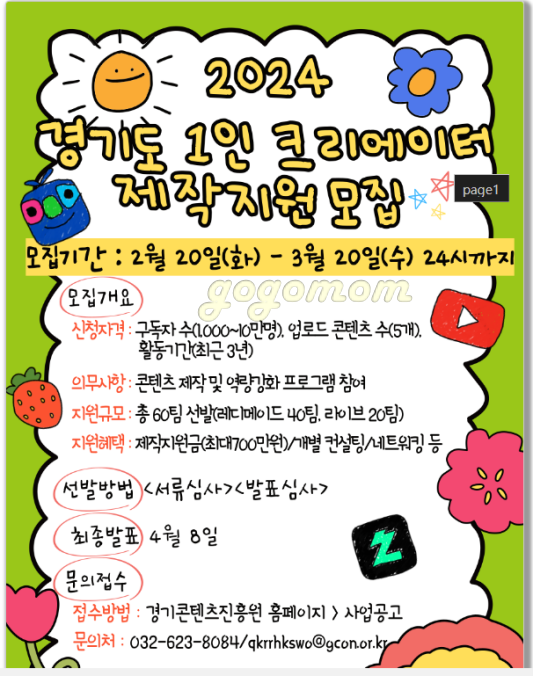 크리에이터 사업이 성장함에 따라 경기도와 경기콘텐츠진흥원이 1인 크리에이터(온라인 영상 창작자)의 성장을 돕는 ‘2024 경기도 1인 크리에이터 제작지원’ 사업 참여자를 3월 20일까지 모집한다고 합니다.
