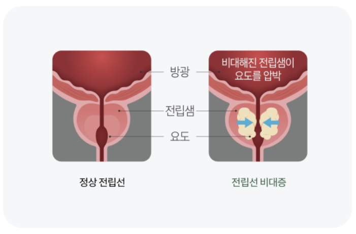 대표적인 중.장년 남성질환 중 하나인 전립선비대증은 나이가 듦에 따라 남성호르몬, 노화, 유전 등의 원인을 전립선이 비정상적으로 커지며 요도가 압박되어 소변이 잘 나오지 못하는 질환입니다.