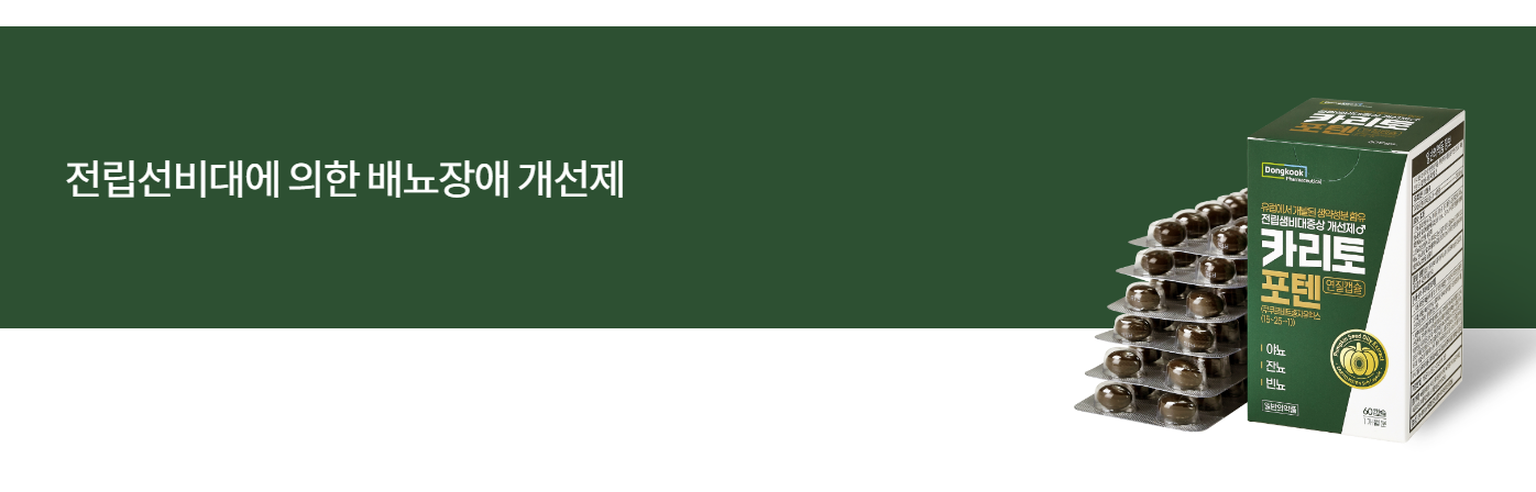 카리토포텐 영양제는 동국제약(주)이 중. 장년 남성의 전립선 관리와 삶의 질 개선을 위해 2022년에 출시한 새로운 전립선비대증 개선제로, 전립선비대에 의한 야뇨, 잔뇨, 빈뇨, 소변량 감소 등의 배뇨장애 개선에 효과적이며, 병원 처방 없이 약국에서 구입할 수 있는 일반의약품입니다.