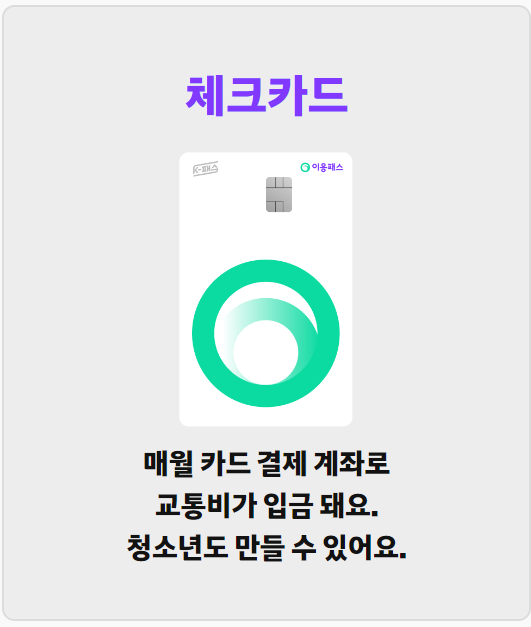 체크카드 - 매월 카드 결제 계좌로 교통비가 입금됩니다. 청소년도 만들 수 있습니다.