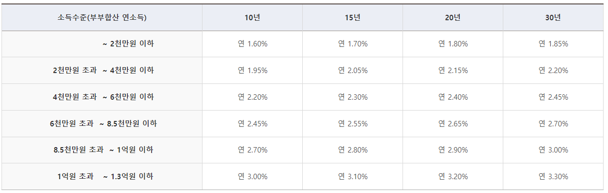 *기본 5년간 위의 특례금리를 적용하며, 적용기간 종료 후에는 대출취급 시 부부합산 소득 수준에 따라 특례금리 적용종료 시 금리를 적용