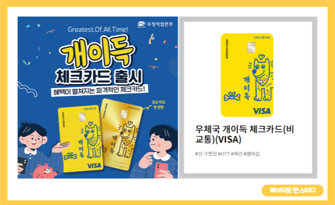 카드 혜택은 점점 줄어들고 있지만 그마저도 놓칠 수 없는 시대입니다. 고물가 시대에 조금이라도 혜택이 있다면 당장 달려들어서 받아내야 합리적인 소비를 하고 있다는 생각이 듭니다. 때마침 우체국에서 야심 차게 출시한 체크카드가 있습니다.