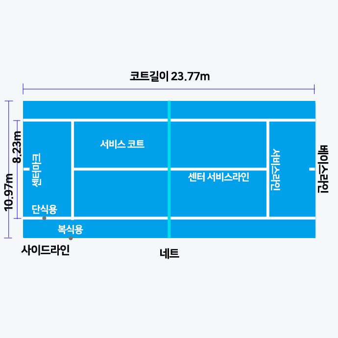 테니스 코트 중앙에 네트를 두고 네트를 넘어온 테니스공이 자신의 진영에 두 번 튀기(바운드) 전에 라켓을 이용하여 공을 상대 진영으로 넘기면 됩니다.