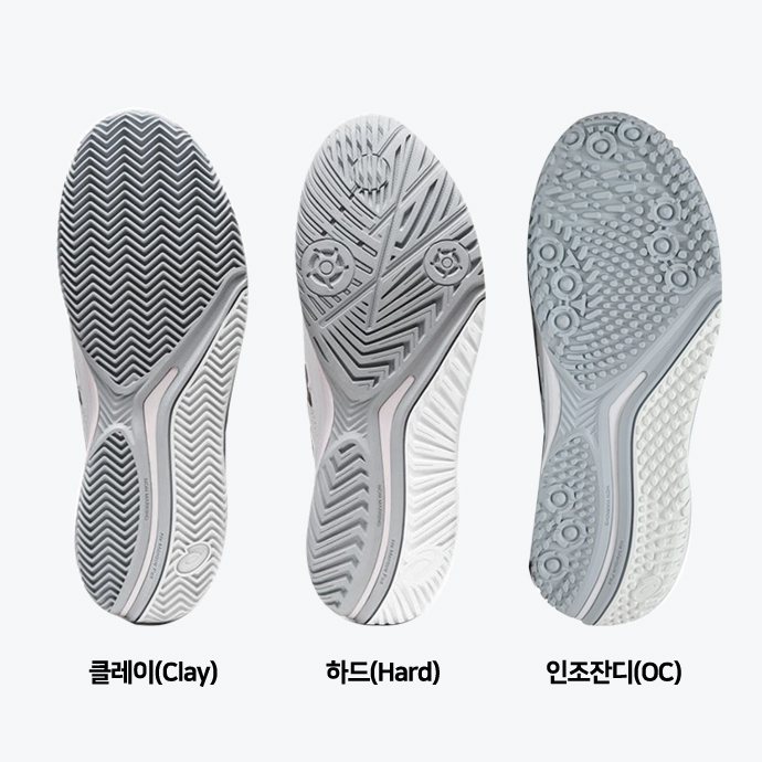 테니스화는 코트의 재질에 따라 나눌 수 있습니다. 코트에 따른 테니스화의 차이는 신발 바닥면의 재질과 패턴입니다.