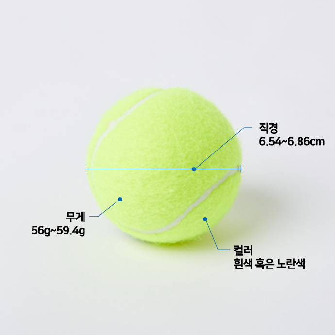 테니스공 규격은 지름은 6.54~6.86cm, 무게는 56~59.4g 사이여야하고, 약 2.54m의 높이에서 지면에서 수직으로 떨어뜨렸을 때 약 1.3~1.5m 사이의 높이로 튀어야 합니다.