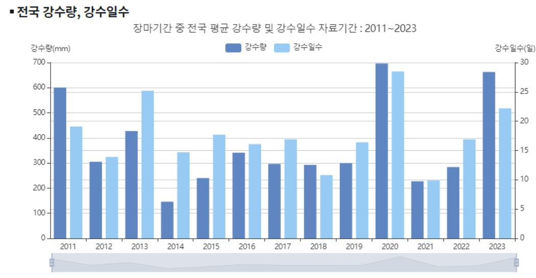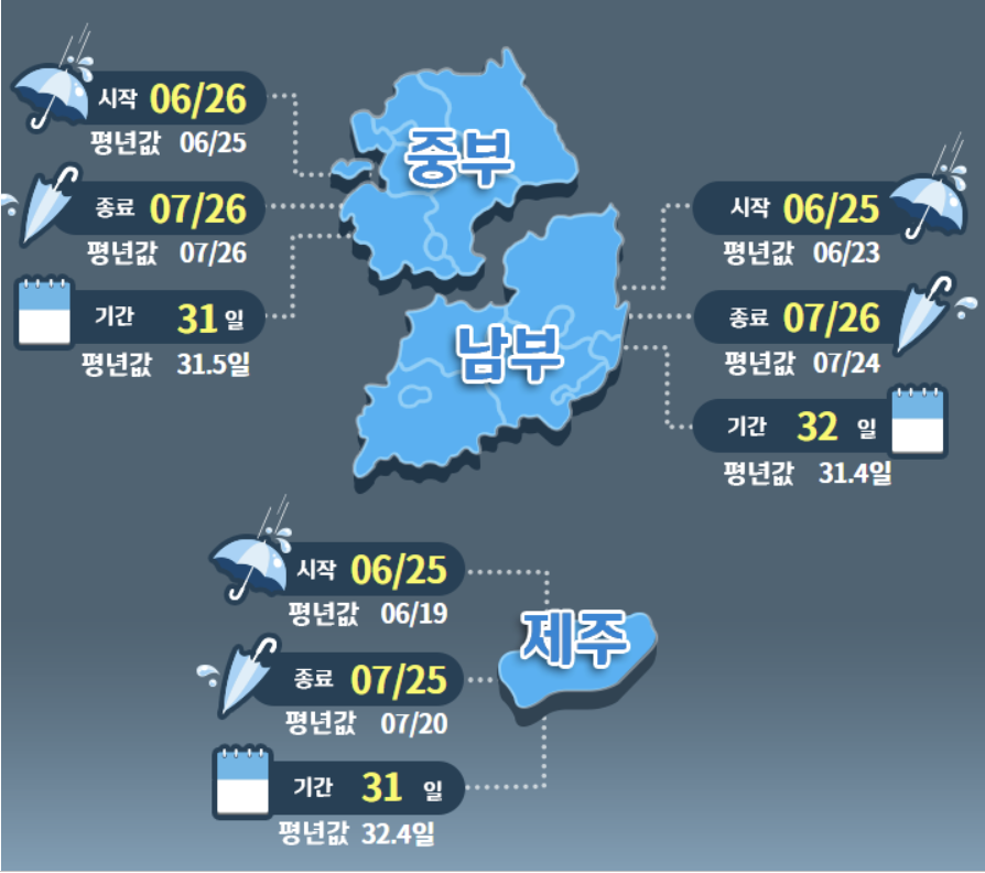 그리고 장마기간엔 비도 더 많이 오고 기온도 높아 불쾌지수가 치솟을것 같은데요. 올해 장마 기간은 언제인지 예상 강우량은 얼마 정도인지 알아보겠습니다.
